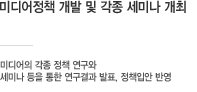 ¶ÇÇÑ ¿¬°£ ¼öÂ÷·ÊÀÇ °¢Á¾ ¼¼¹Ì³ª¿Í Åä·Ðȸ ¹× ¹ßǥȸ¸¦ ÅëÇØ¼ ¿¬±¸ °á°ú¸¦ ¹ßÇ¥Çϰí Á¤Ã¥ÀԾȿ¡ ¹Ý¿µÇϱâ À§ÇÏ¿© ³ë·ÂÇϰí ÀÖ´Ù. ƯÈ÷ ¿Ü±¹ÀÇ ¹Ìµð¾î¼¾ÅÍ °ü°èÀÚ ¹× ¹Ìµð