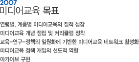 2007³âÀº °¢ ¿µ¿ªÀ» ¾Æ¿ì¸£´Â °øÅëÀÇ ¹®Á¦¸¦ º¸´Ù ¸íÈ®È÷ Çϰí, ±³À°ÀÇ ÁúÀû ¼ºÀåÀ» ²ÒÇÒ ¼ö ÀÖµµ·Ï ±³À°, ¿¬±¸, Á¤Ã¥Àû °úÁ¦¸¦ ¹ßÀü½ÃÄѳª°¥ °ÍÀÌ´Ù. À̸¦ ÅëÇØ ¼¼ °¡Áö Â÷¿ø Áï, Ä¿¹Â´ÏÄÉÀÌ¼Ç ±Ç¸®·Î¼­ ¹Ìµð¾î±³À°, Àΰ£ÀÇ Á¸Àç·ÐÀû Àǹ̷μ­ ¹Ìµð¾î±³À°, »çȸ¸¦ »ì¾Æ°¡´Â »ýÁ¸À¸·Î¼­ÀÇ ¹Ìµð¾î±³À°À» ½ÇÇöÇϵµ·Ï ÇÑ´Ù.