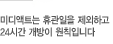¹Ìµð¾×Æ®ÀÇ ¸ðµç Áö¿ø½Ã¼³Àº 24½Ã°£ °³¹æÀ» ¿øÄ¢À¸·Î ÇÕ´Ï´Ù.